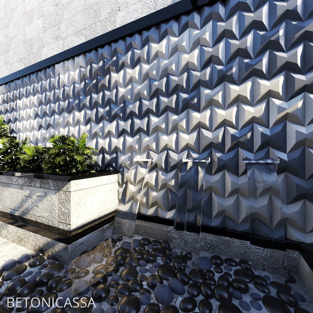 Dış mekânlarda güçlü yüzey etkisi oluşturan 3D geometrik form Villa, restoran ve modern konut cephelerinde dekoratif kaplama Geniş yüzeylerde ritmik ve modern mimari ifade Tüm RAL & NCS renklerinde özel üretim Mimarlara özel CAD / DWG dosyaları Dış ortam koşullarına dayanıklı beton kompozit Uzun ömürlü fiber takviyeli yapı